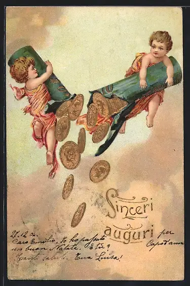 AK zwei Engel öffnen eine Münzrolle, Geld, Neujahr
