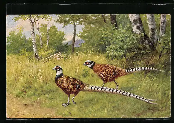 AK zwei Fasane in einem Birkenwald