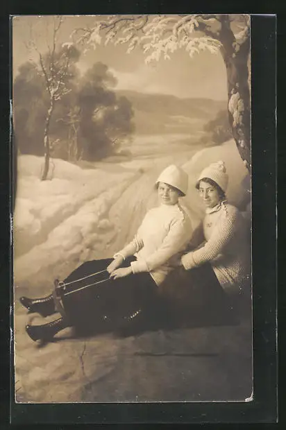 AK zwei Frauen sitzen auf einem Schlitten vor einer Winterlandschaft
