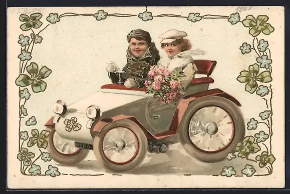 AK zwei Kinder in einem Auto, Neujahr, Klee, Vergissmeinnicht