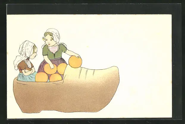 AK zwei Mädchen in niederländischen Trachtkleidern sitzen in einem grossen Holzschuh