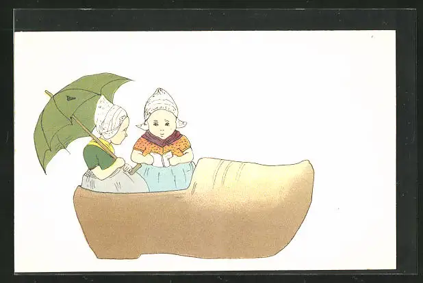 AK zwei Mädchen in niederländischen Trachtkleidern sitzen in einem grossen Holzschuh