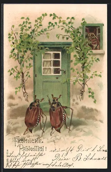 AK zwei Maikäfer vor einer Haustür, Pfingstgruss