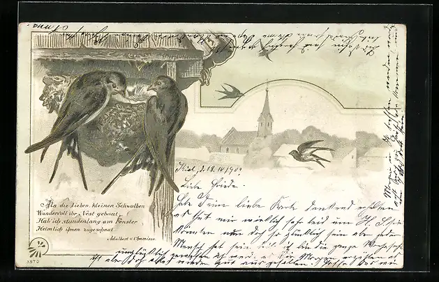 AK zwei Schwalben an ihrem Nest unter dem Dach