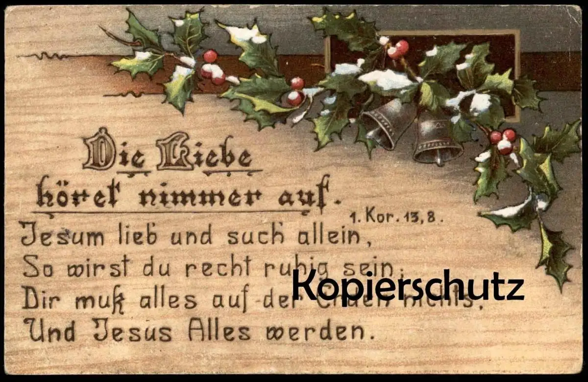ALTE KÜNSTLER POSTKARTE HOLZBRANDMALEREI IMITAT WEIHNACHTEN NEUJAHR ILEX CHRISTLICHER SPRUCH 1. BUCH KORINTHER 13,8 “DIE LIEBE HÖRET NIMMER AUF. JESUM LIEB´ UND SUCH´ ALLEIN, SO WIRST DU RECHT RUHIG SEIN; DIR MUSS ALLES AUF DER ERDEN NICHTS UND JESUS ALLES WERDEN.”