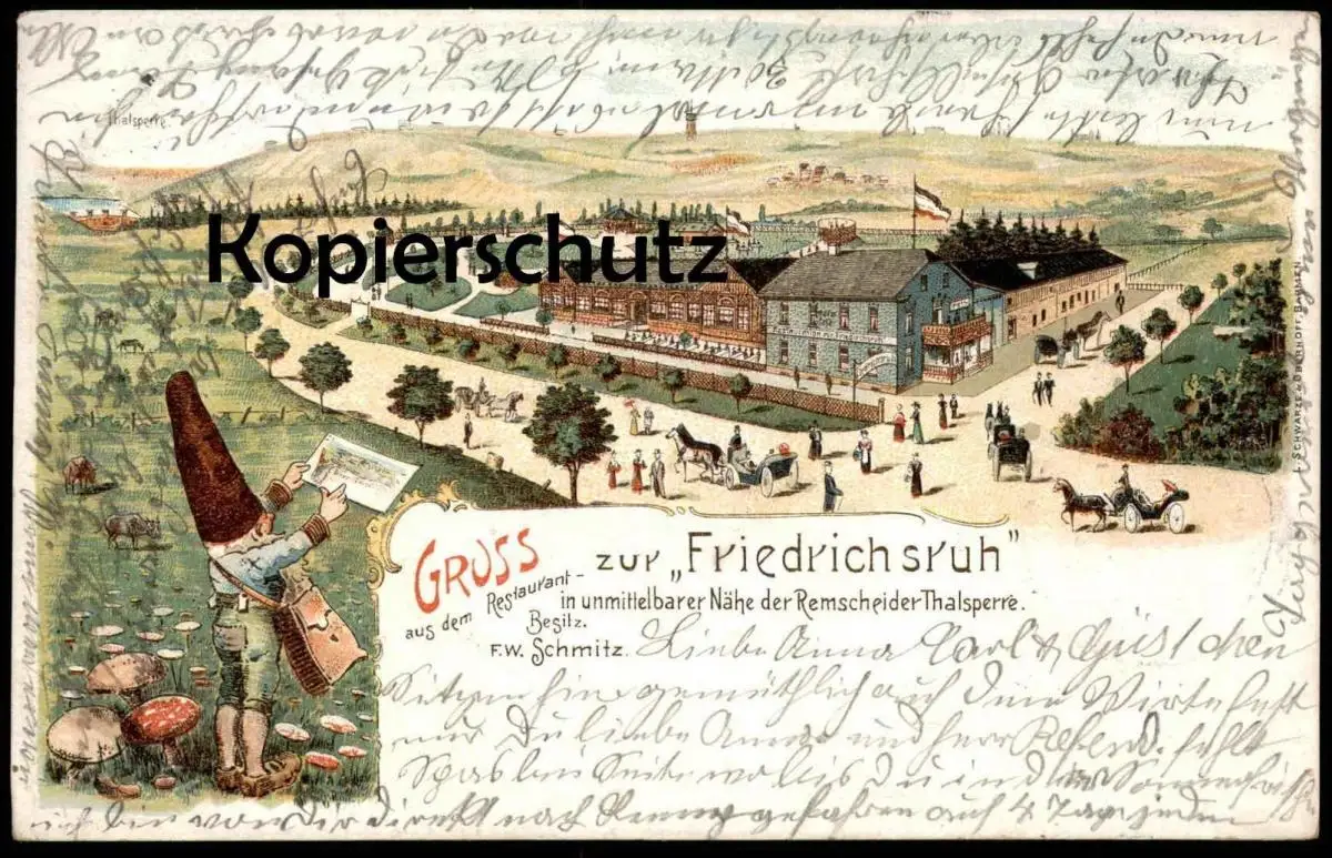 ALTE LITHO POSTKARTE GRUSS AUS DEM RESTAURANT FRIEDRICHSRUH NÄHE REMSCHEIDER THALSPERRE Talsperre Remscheid Zwerg dwarf
