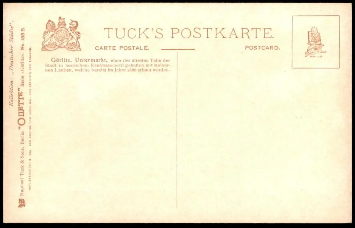 ALTE POSTKARTE GÖRLITZ UNTERMARKT EINER DER ÄLTESTEN TEILE DER STADT IN HERRLICHEM RENAISSANCESTIL GEHALTEN MIT STEINERNEN LAUBEN, WELCHE BEREITS IM JAHR 1526 ERBAUT WURDENVerlag: Raphael Tuck & Sons, Berlin, Oilette Serie Görlitz No. 188 B, Kollektion Deutscher StädteGelaufen: neinErhaltung (s. Scan): sehr gut / 916457