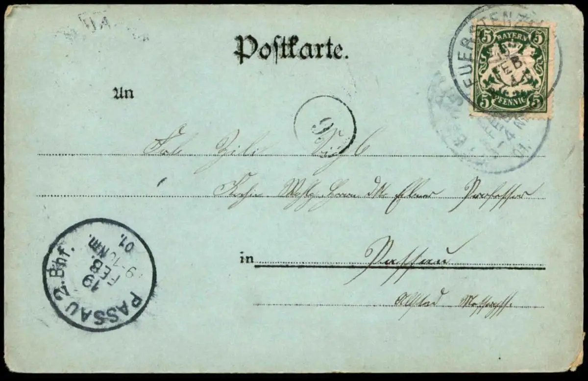Gelaufen: 19.02.1901 mit Stempel Fuerstenzell nach Passau