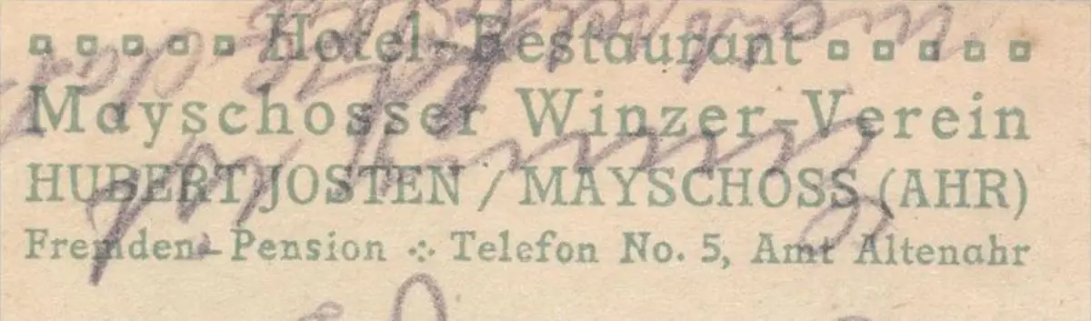ALTE POSTKARTE MAYSCHOSSER WINZER-VEREIN MAYSCHOSS HOTEL-RESTAURANT HUBERT JOSTEN FREMDEN-PENSION TELEFON NO. 5 AMT ALTENAHRVerlag: Wilh. Fülle, Barmen