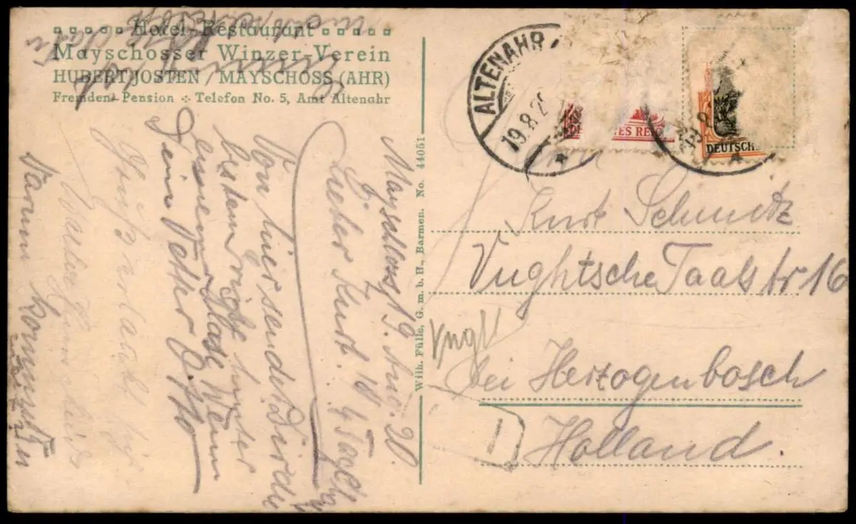 Gelaufen: 19.08.1920 mit Stempel Altenahr nach Herzogenbosch, Briefmarken teilweise entfernt