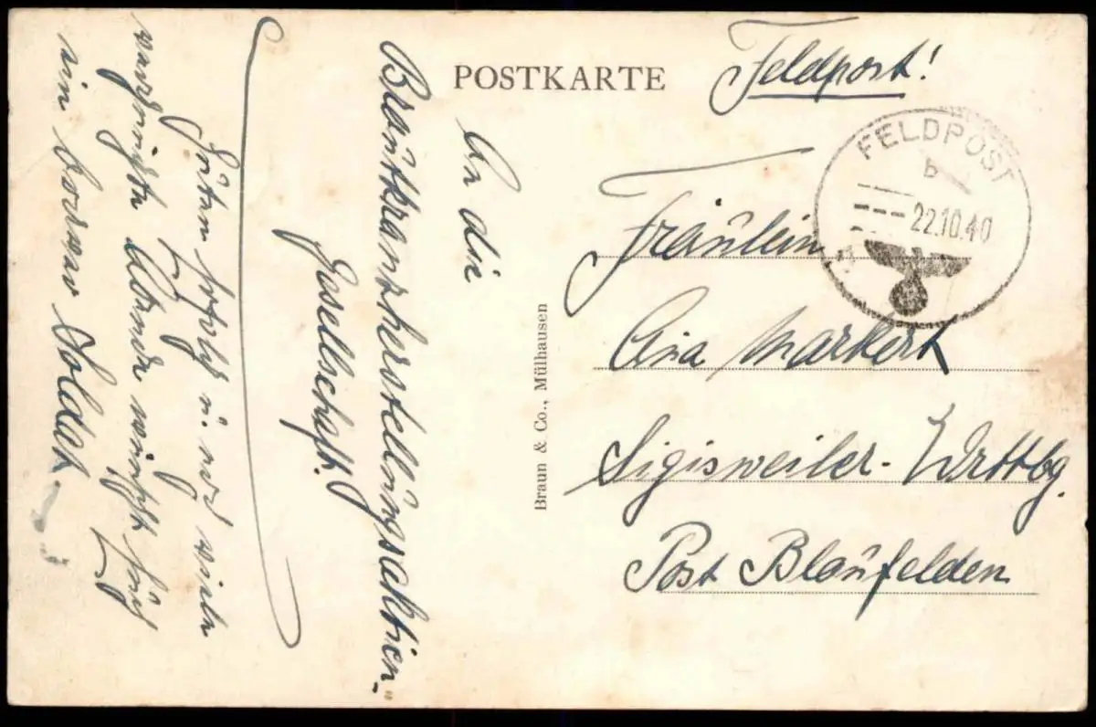Gelaufen: 22.10.1940 mit Feldpost-Stempel an die "Brautkranzherstellungsaktiengesellschaft" nach Sigisweiler, Post Blaufelden