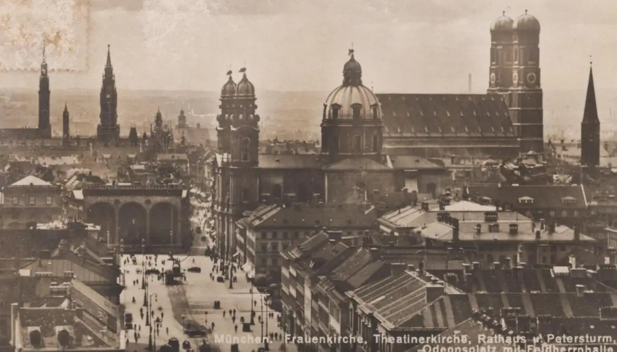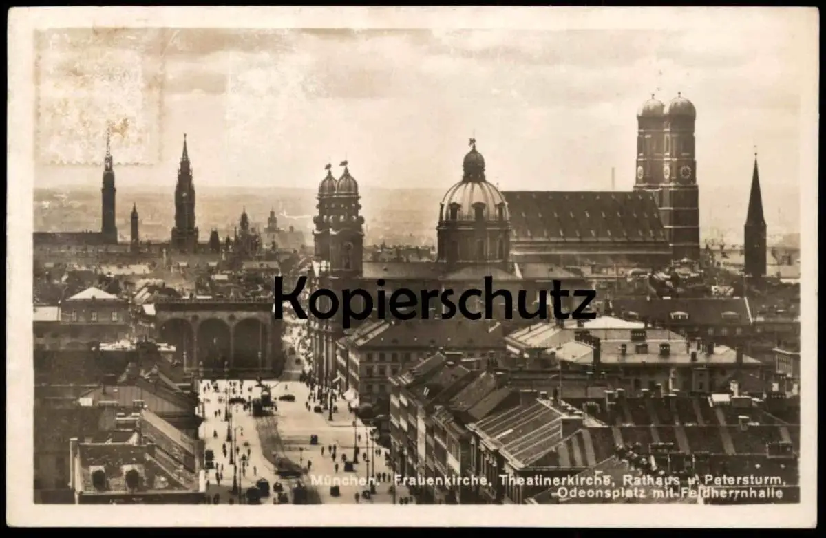 ALTE POSTKARTE MÜNCHEN FRAUENKIRCHE THEATINERKIRCHE RATHAUS U. PETERSTURM ODEONSPLATZ MIT FELDHERRNHALLE
