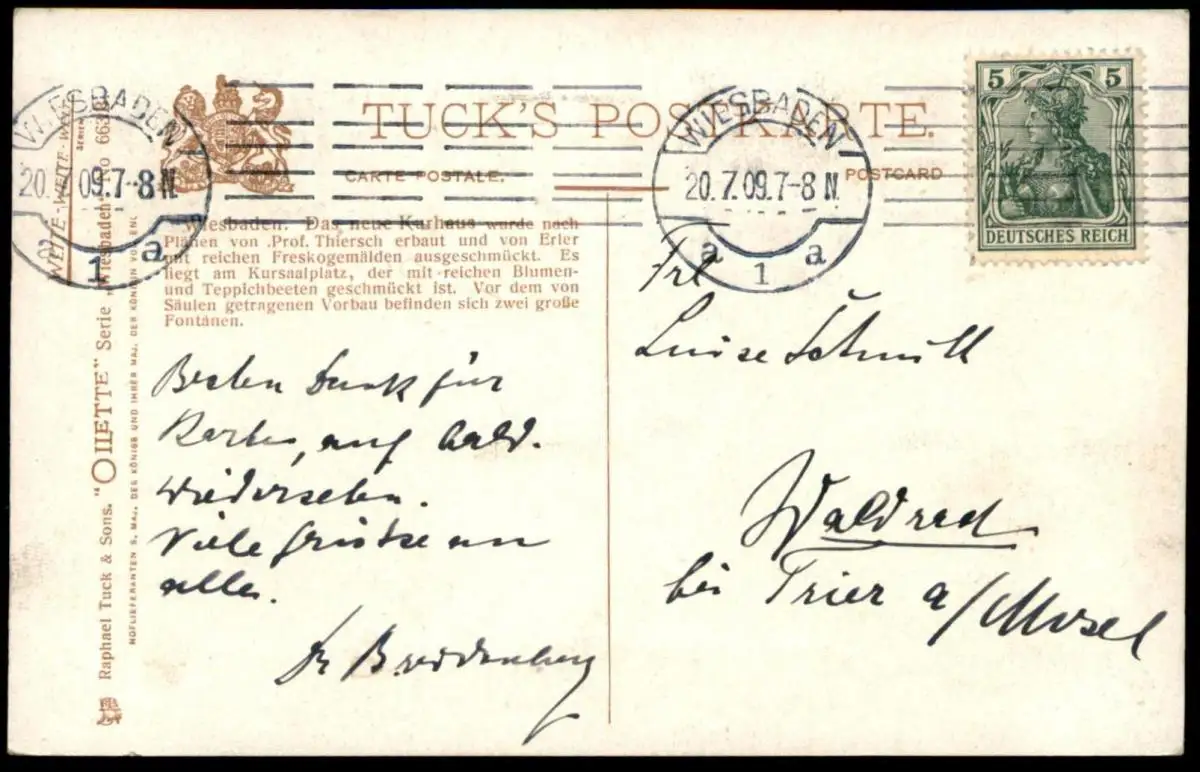Gelaufen: 20.07.1909 mit Stempel Wiesbaden nach Waldrach bei TrierErhaltung (s. Scan): gut / 915872