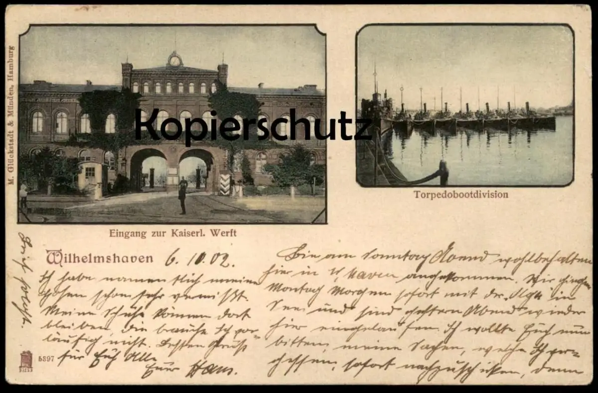 ALTE POSTKARTE WILHELMSHAVEN EINGANG ZUR KAISERLICHEN WERFT TORPEDOBOOTDIVISION Schiff battle ship Kriegsschiff warship