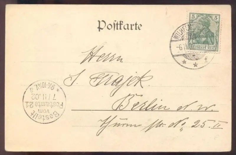 Verlag: M. Glückstadt & Münden, HamburgGelaufen: 06.11.1902 mit Stempel Wilhelmshaven sowie Ankunftsstempel Berlin Postamte 21 07.11.1902Erhaltung (s. Scan): gut / 915710