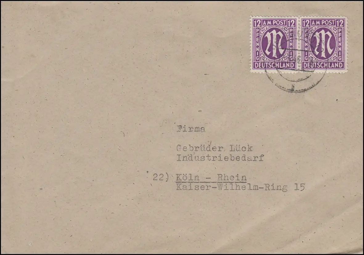 AM-Post 12 Pf Paar MeF Brief Dominitwerke DORTMUND 10 - 12.3.1946 nach Köln