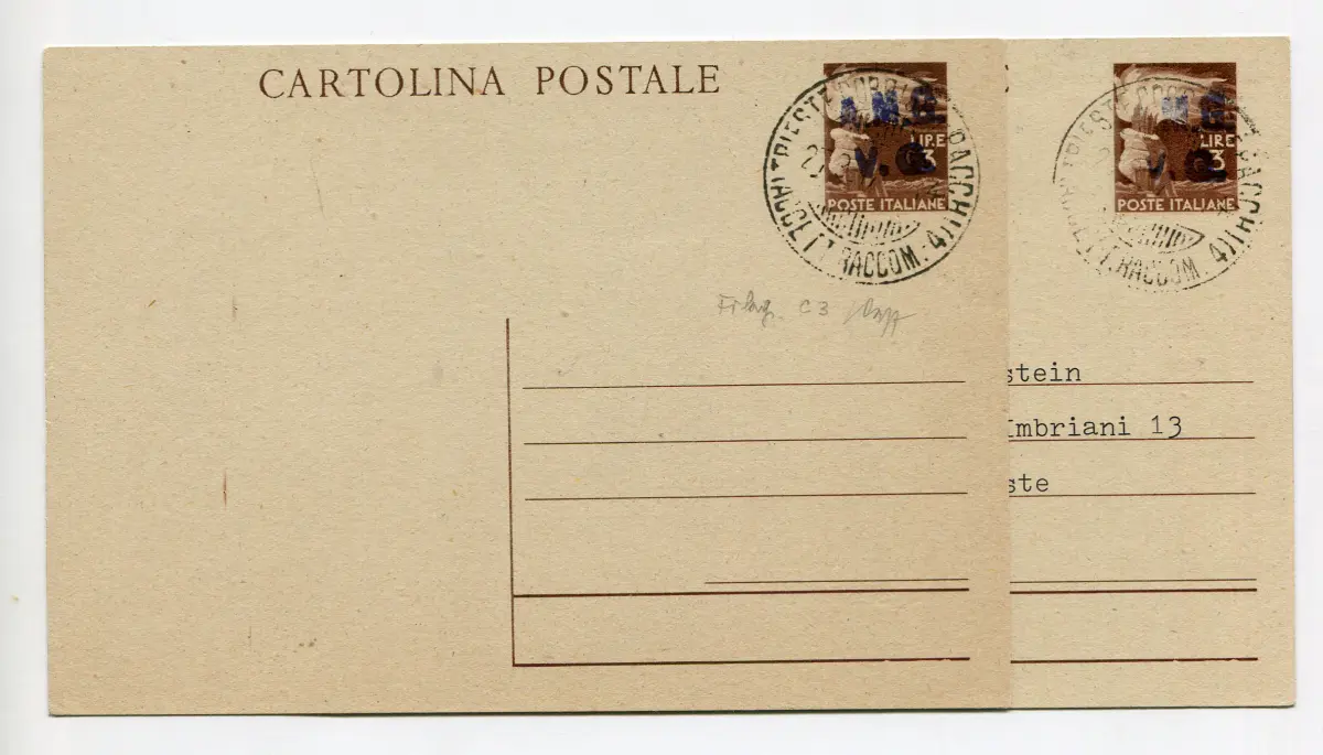 AMG. Sehr guter Zustand. - CP Lire 3 Democratica Nr. C 3 zwei gebrauchte Postkarten Postkarte - AMG. Sehr guter Zustand. - CP Lire 3 Democratica Nr. C 3 zwei gebrauchte (nicht gereiste) Postkarten mit violettem Aufdruck - eine mit unvollständigem Aufdruck (ohne AMG A) Cod. 1190/14