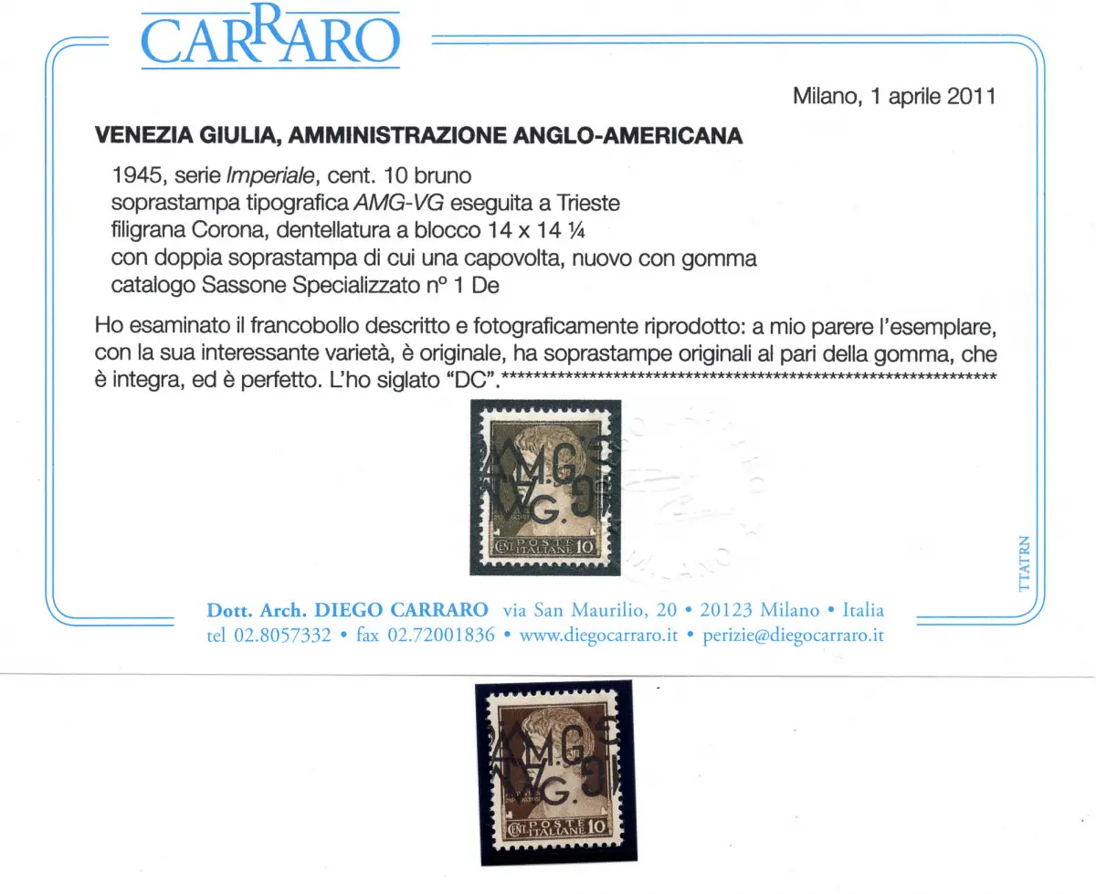 ** MNH - AMG.VG. - Cent. 10 n. 1f schönes Exemplar mit doppeltem Aufdruck, davon einer umgedreht (horizontal verschoben) - Ungewöhnlich - Zert. Carraro - Kat.euro650 Nr. 950/20