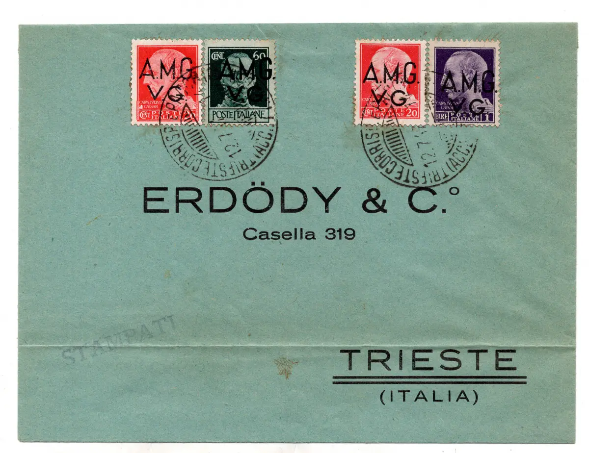 AMG.VG. - Cent. 20 Nr. 5 + Ergänzungen Nr. 3 + 6 + 8 auf Umschlag (Drucke) nach Rom am 12.7.47 mit Ann. Ankunft - wertvolle Nutzung des Cent. 20 ohne Wasserzeichen - Umschlag unten gefaltet Nr. 952/20