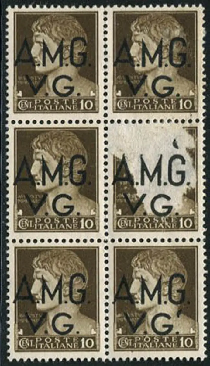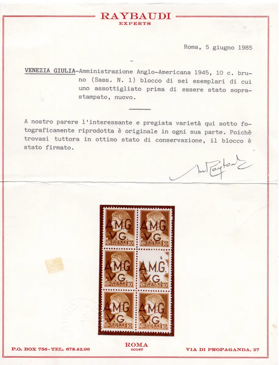 Vollgummi MNH-AMG. Sehr guter Zustand. - Cent. 10 Nr. 1 Block mit sechs Exemplaren, davon eines mit Druck weitgehend vor dem Überdruck abgeschliffen - Auffällige Sorte, wohl Unikat - ED und Cert. Ray. Code 748/11