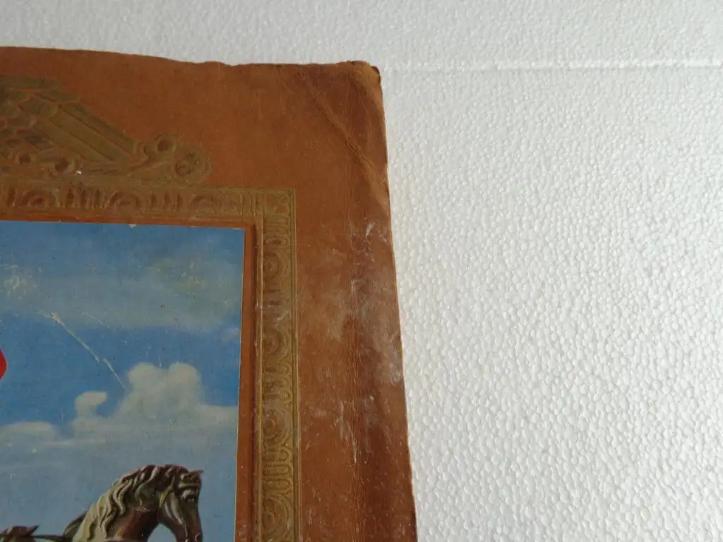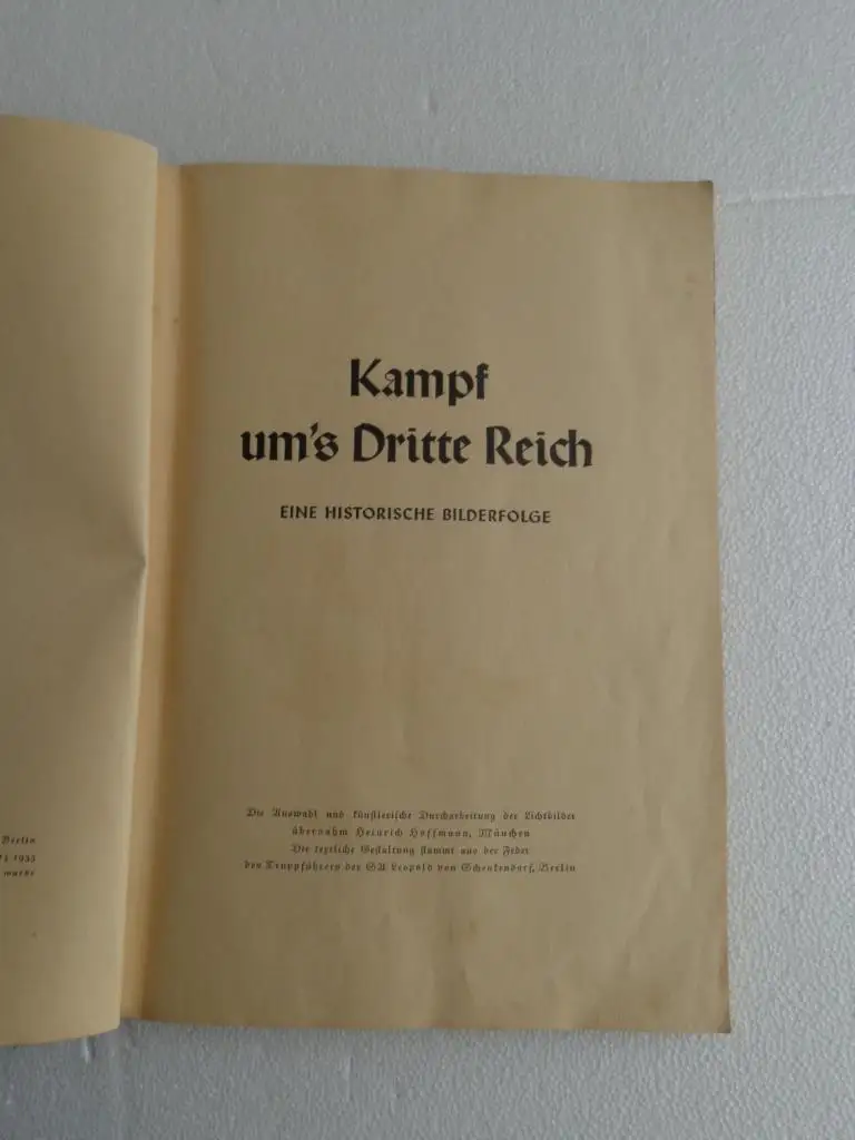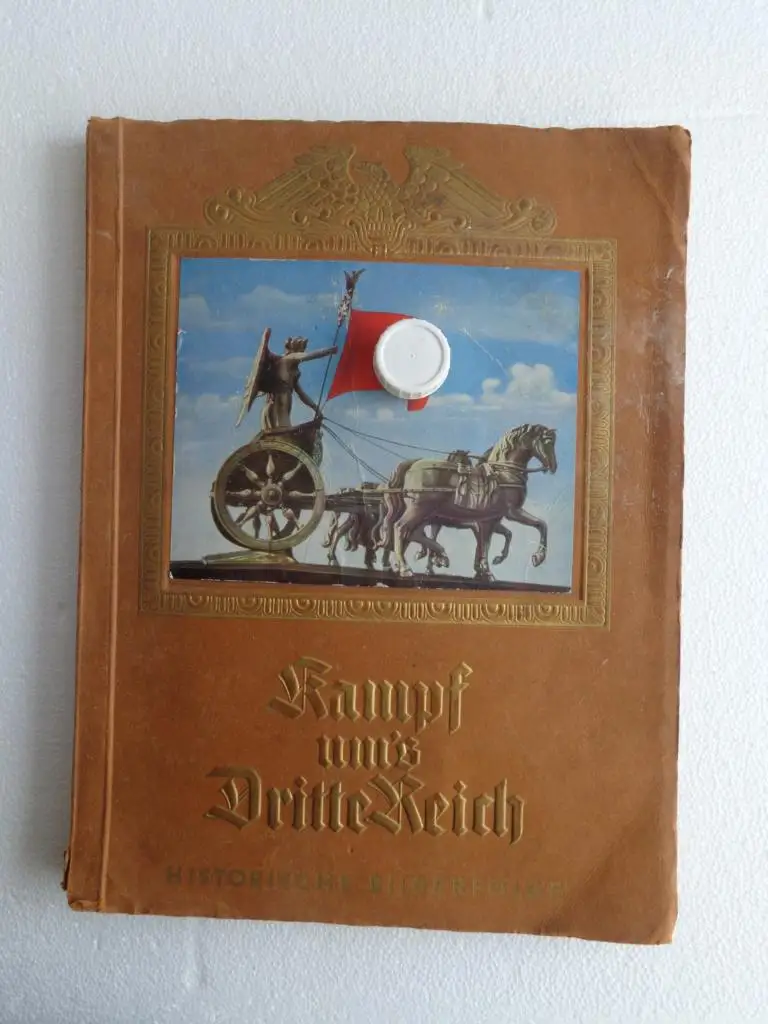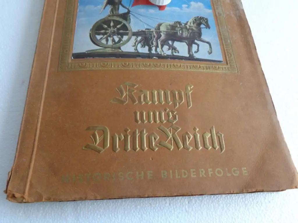 Aus einem Militaria Sammlung Nachlass stammen u.a. auch Dokumente, Bücher und andere literarische Erzeugnisse. Dieses Cigaretten Sammelbilder Album von 1933 ist komplett - 13 Bilder sind einzukleben. Paar Gebrauchsspuren auf dem goldgeprägtem Einband, Nichtraucherhaushalt, Einbandrücken unten kleiner Einriss, geringe Bestossung an Einbandkante, insgesamt guter Erhalt für dieses gebrauchte Objekt. Auf 92 Seiten werden zu 34 Sachgebieten Textdarstellungen und Bilder offeriert um eine geschichtliche Zeit Deutschlands aus Sicht der damaligen Aktualität zu dokumentieren. Das Album ist komplett.