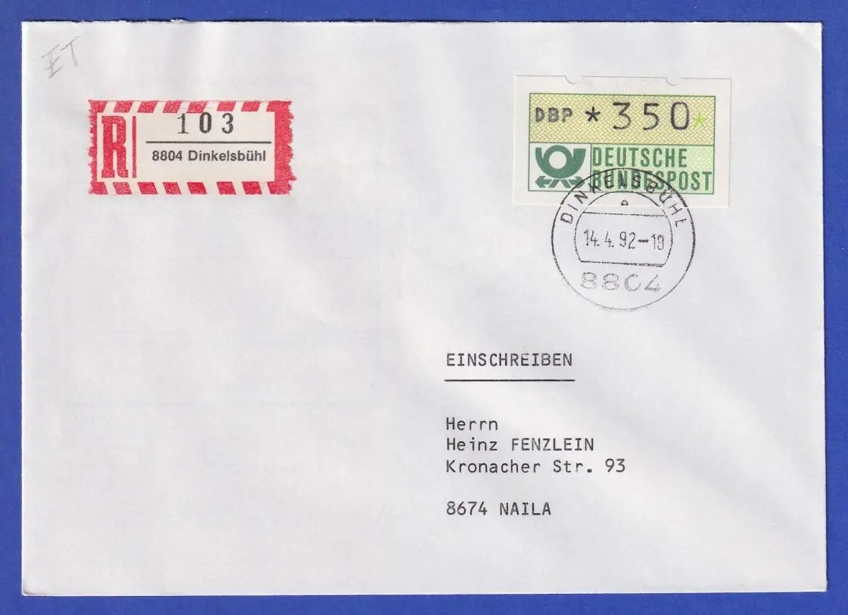 ATM Typ NAGLER Mi.-Nr. 1.2 Wert 350 auf R-Brief, O DINKELSBÜHL14.4.92 ALBINO !