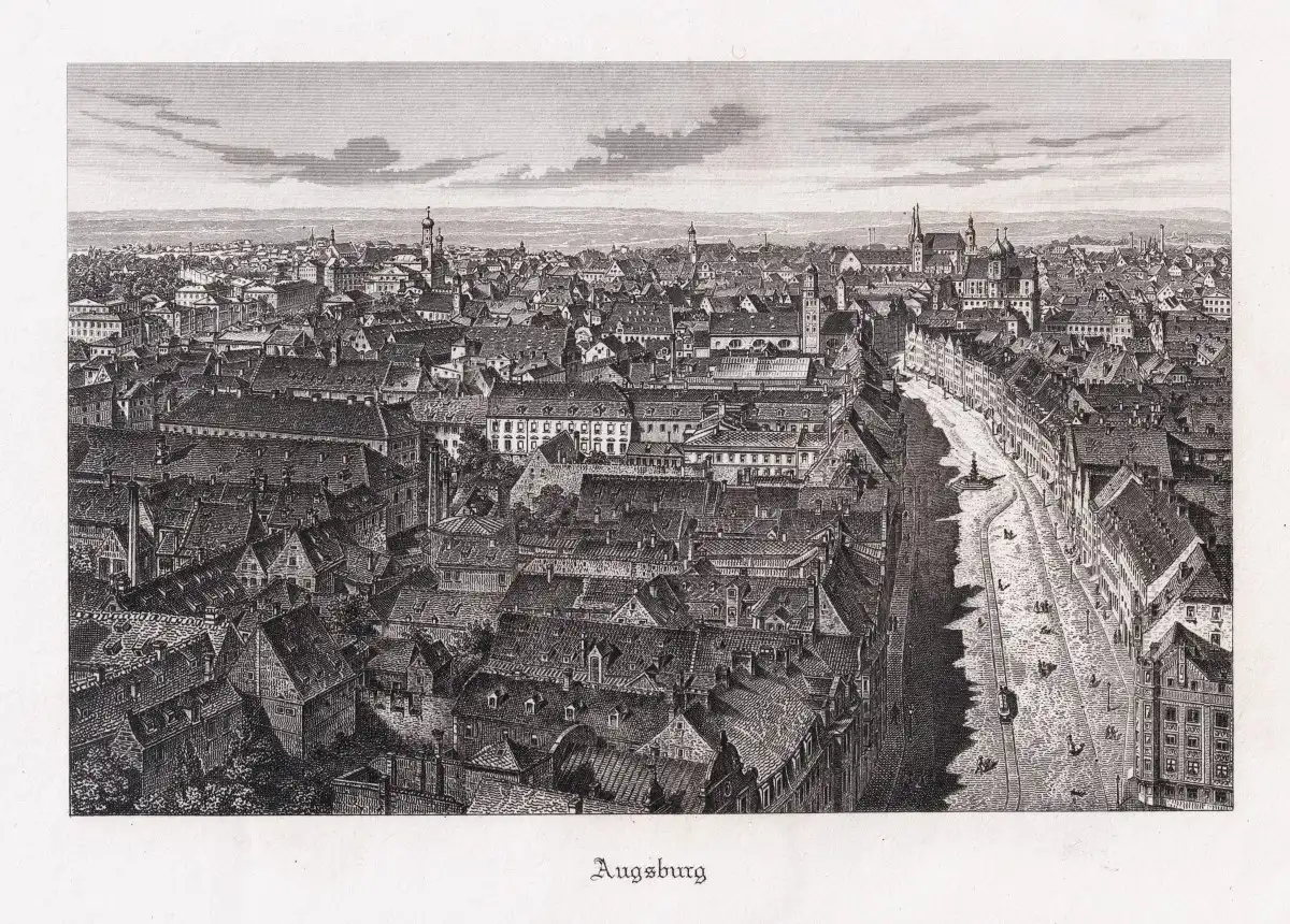 Augsburg, Gesamtansicht. Originaler Stahlstich um 1850