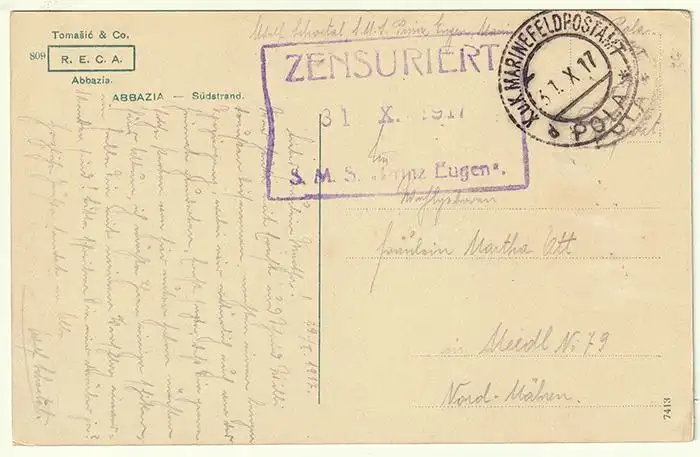 Bemerkungen: Gelaufen m. Stempel: Zensuriert/31.X.1917/S.M.S. "Prinz Eugen" Kastenst. violett - KALIS16-P.25 - neben K.u.K.MFPA/31 x 17/d Pola.