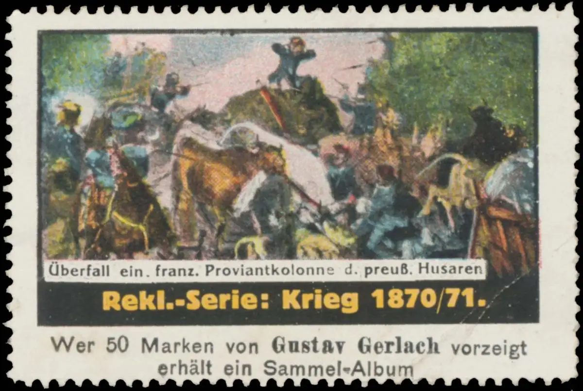 Reklamemarken-Serie: Krieg 1870/71, wer 50 Marken von Gustav Gerlach vorzeigt erhält ein Sammel-Album., Größe/Zustand: 4x6 , guter Zustand, Original alte Reklamemarke die seinerzeit für die Werbung benutzt wurde