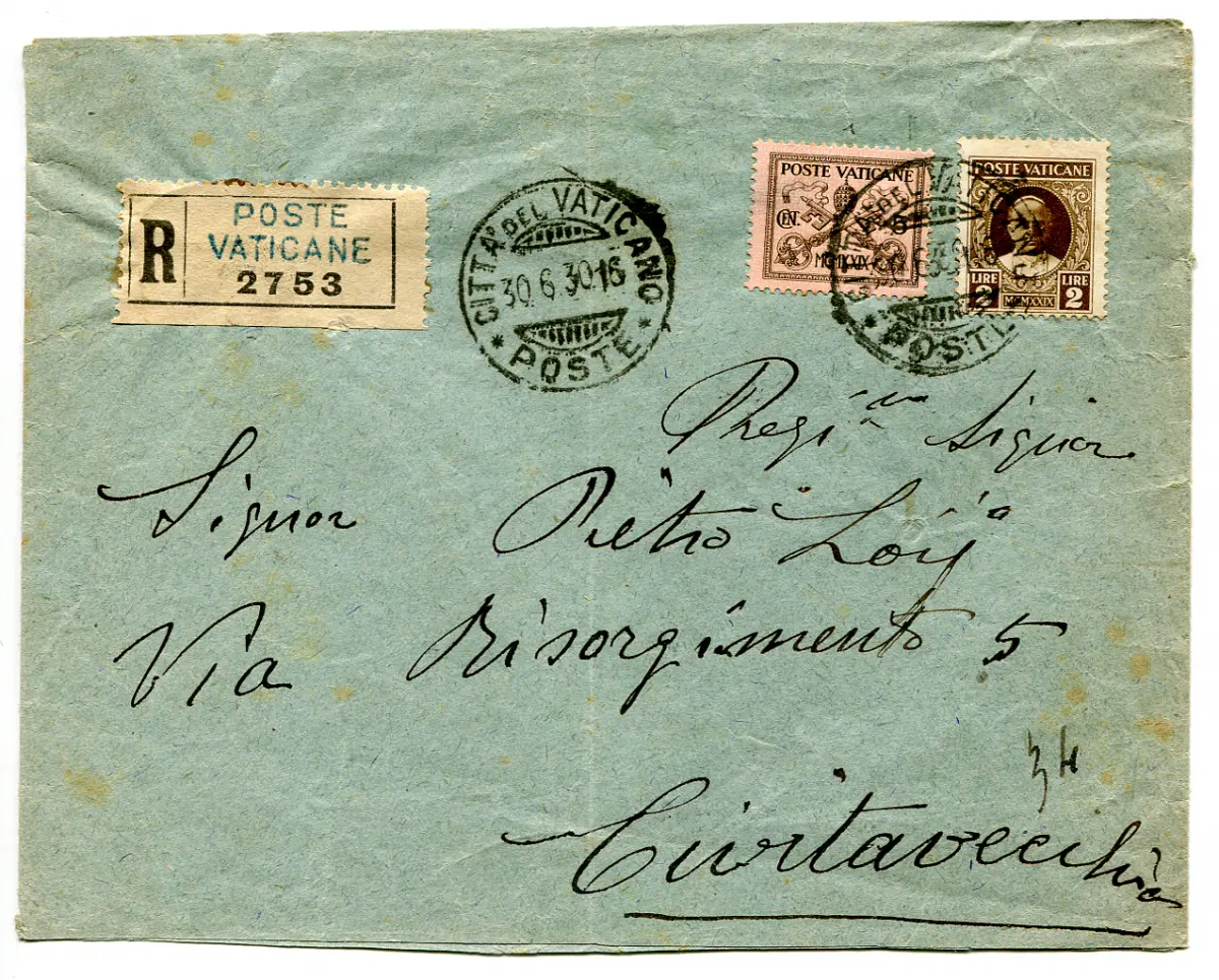 Schlichtung - Empfohlen für den Innenbereich Umschlag - Schlichtung Lire 2 Nr. 10 + Ergänzung Nr. 1 auf Umschlag Racc. für Civitavecchia am 30.6.30 im Tarif gereist - mittig gefalteter Umschlag, perfekte Briefmarken Katalog Euro30 Cod.1136/WEB