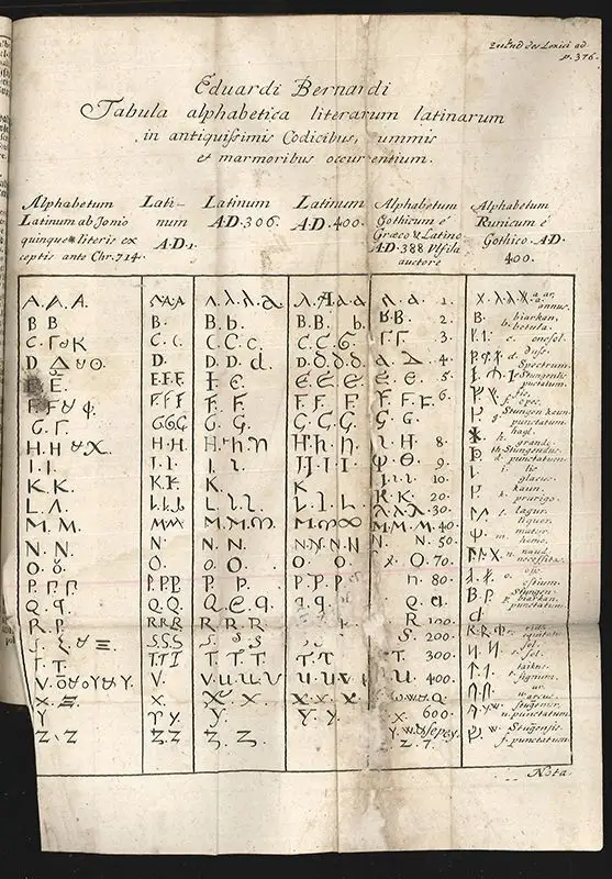 [Ratisbonae et Viennae, Bader 1713]. 2 Tle. in 1 Bd. gr.-8°. 13 (v. 14) Bll., 1152; 376 S., 41 (v. 49) Bll. (Register). Mit gest, Frontisp. u. 1 gefalt. Tab. m. verschiedenen Alphabeten (Tabula alphabetica literarum latinarum in antiquissimis Codicibus...). Ldr. d. Zt. Titelbl. fehlt.