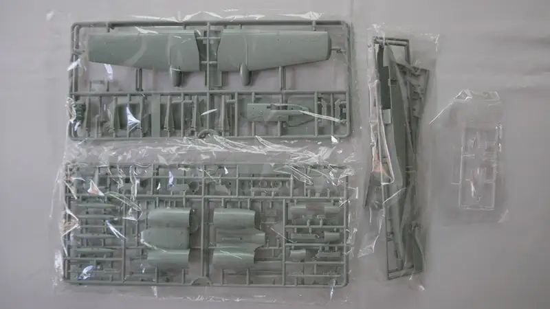 Einzelteile (Plastikbauteile) sind noch am Rahmen fixiert, 3 von 4 Sichthüllen sind noch versiegelt, 1 Sichthülle wurde geöffnet.
