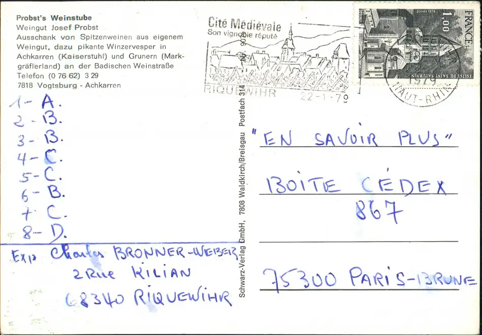 Achkarren-Vogtsburg im Kaiserstuhl Probst Weinstube Weingut Josef Probst 1979