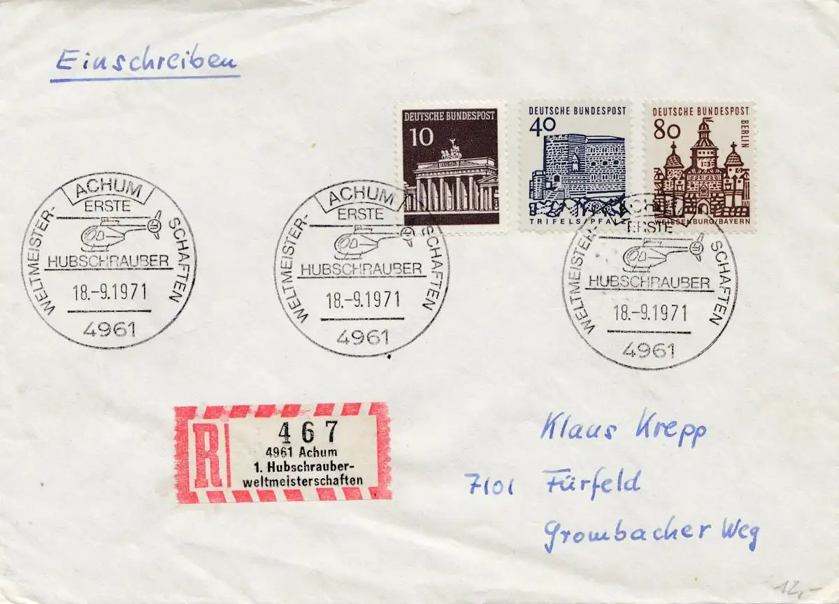 Achum Erste Hubschrauber WM 1971 nach Fürfeld. R-Brief-R-Zettel
