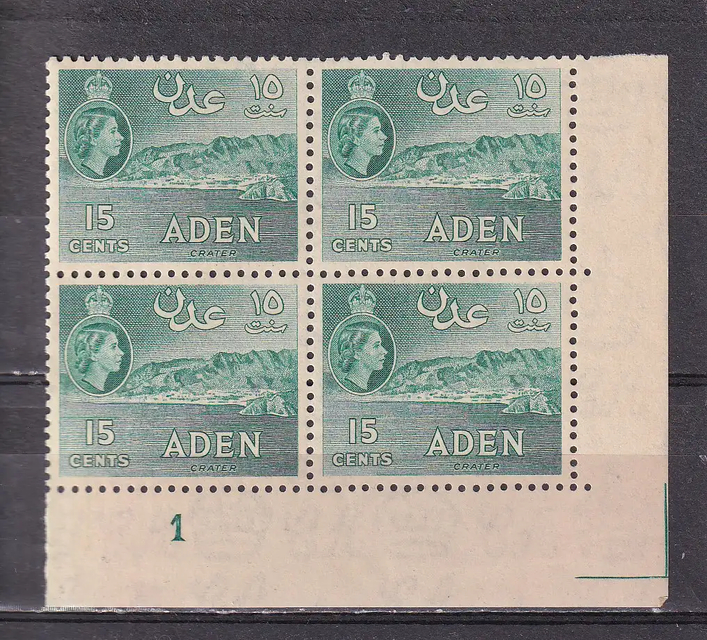 ADEN 1953 LOT QEII 15c/ SG 50 ECKRAND VIERERBLOCK MIT PLATTENNUMMER POSTFRISCH/**