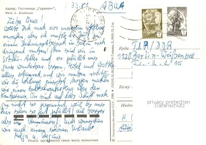 Adler_Sotschi Gorizont Adler_Sotschi postalisch gelaufen nach 1965 Erhaltung siehe scans [DarjaD84] DarjID84