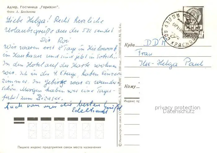 Adler_Sotschi Hotel Horisont Adler_Sotschi postalisch gelaufen nach 1965 Ganzsache (eingedruckte Briefmarke) Erhaltung siehe scans [NatalD47] Ganzsache (eingedruckte Briefmarke) NataID47