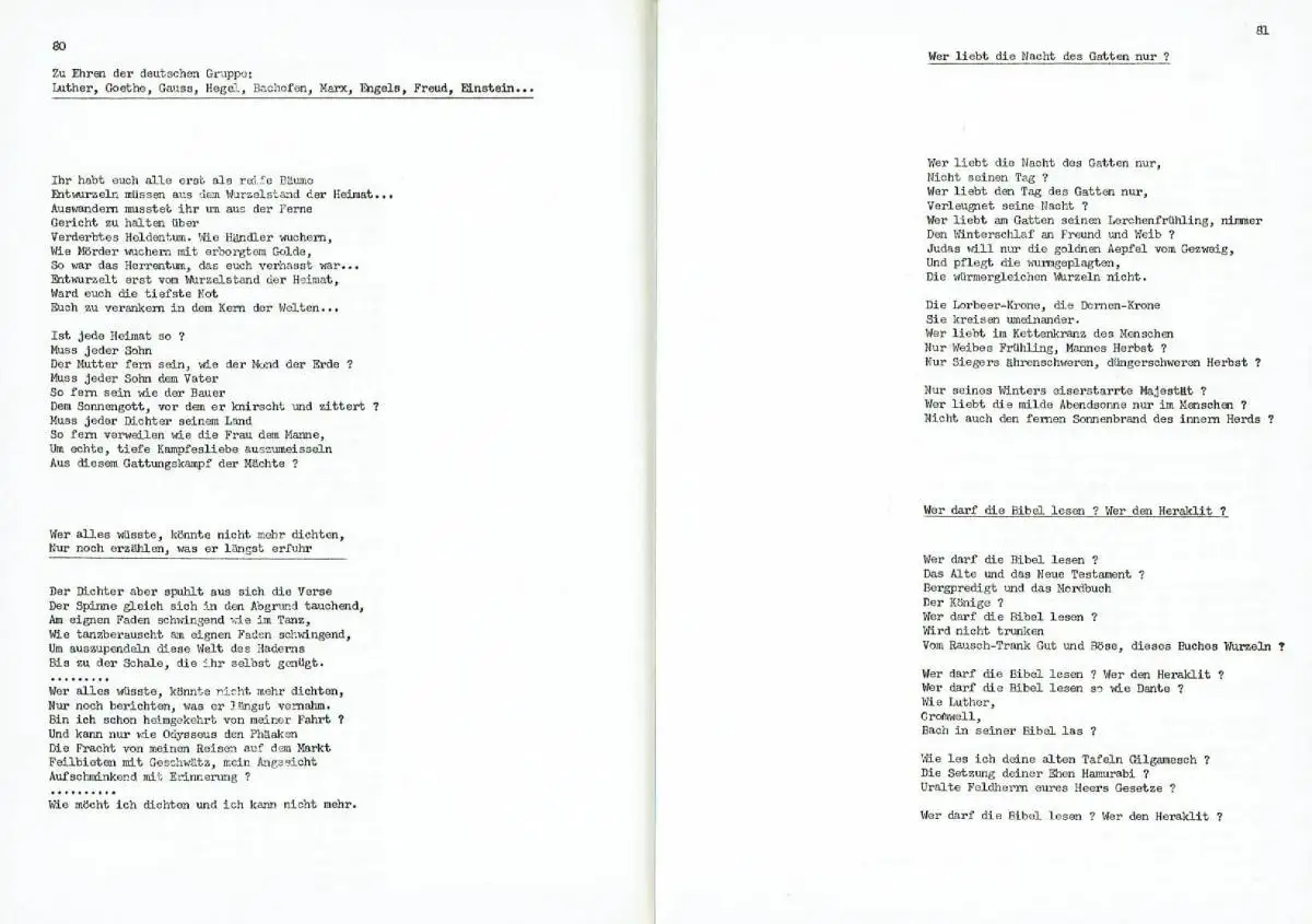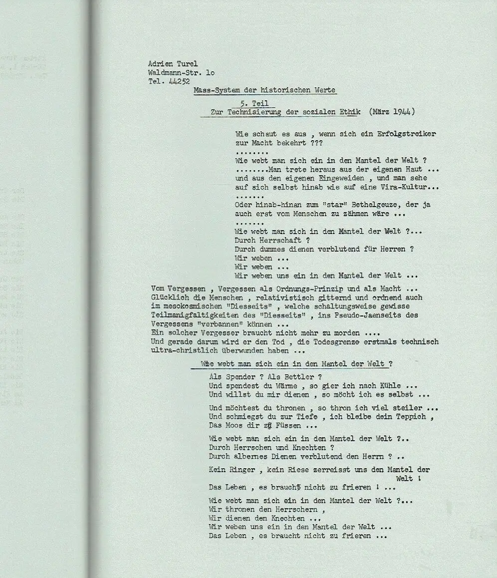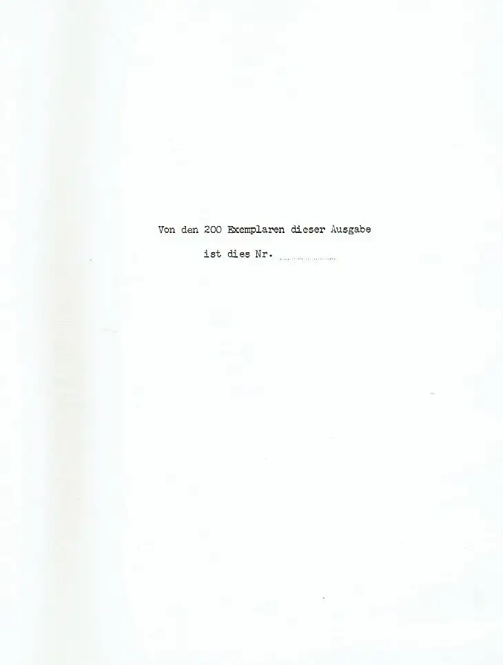 sehr guter Zustand, geringe Gebrauchs- und Alterungsspuren: Einband teils etwas vergilbt - Seiten vereinzelt etwas eselsohrig, Hektographiertes Manuskript in einer Auflage von 200 Exemplaren erschienen, das vorliegende Buch ist nicht nummeriert "Zum zweiten Band unserer Dokumentationen. Dieser zweite Band enthält ausser einigen wenigen veröffentlichten Gedichten und Pseudo Heraklitischen Fragmenten keine von Adrien Turel als druckfertig bezeichneten Niederschriften.In Anbetracht der stilgebenden Bedeutung, die Adrien Turel der grossen Lyrik zugemessen hat, fügen wir in einem Anhang verschiedene seiner Aeusserungen und seiner Aufsätze über Lyrik hinzu und, um einen Einblick in sein Schaffen zu ermöglichen, eine Anzahl identisch abgeschriebener Manuskriptseiten." (Vorwort) "Adrien Turel (* 5. Juni 1890 in Sankt Petersburg; † 29. Juni 1957 in Zürich) war ein Schweizer Schriftsteller. Adrien Turel wurde 1890 als Sohn schweizerisch-deutscher Eltern in der Hauptstadt des damaligen Russischen Reiches geboren ... studierte ab 1912 Germanistik, Romanistik und Geschichte. 1917 lernte er über Magnus Hirschfeld und Heinrich Körber die Psychoanalyse kennen, brach sein Studium ab und arbeitete zwei Jahre als Lehrer am Französischen Gymnasium. Als Spartakist verdächtigt, wurde er in Moabit für zwei Monate inhaftiert. Er schrieb Artikel für verschiedene Zeitungen und fand in Oskar Loerke einen Freund, der 1919 seinen ersten Essayband beim S. Fischer Verlag herausgab ... Von etwa 1927 bis 1930 wohnte Turel bei Adolf Moritz Steinschneider in Frankfurt am Main. Von 1932 bis 1933 war er Mitarbeiter in der Redaktion der von Franz Jung herausgegebenen Zeitschrift „Gegner“ – ein Blatt, das sich bemühte, Jugendliche aus allen Konfessionen und politischen Richtungen anzusprechen. Im März 1932 war Harro Schulze-Boysen als Schriftleiter dieser Zeitschrift eingesetzt worden und bemühte sich, dem Blatt ein neues Gepräge zu geben. Begleitet wurden die laufenden „Gegner“-Ausgaben von monatlichen Ausspracheabenden, deren Teilnehmer vorrangig Jugendliche waren, die Fragen stellten und Antworten hören wollten. Als ständiger Mitarbeiter und Diskutant nahm Turel als „Querwelterindenker“ sehr häufig an diesen Gesprächskreisen teil. Für den aus der jüdischen Jugendbewegung kommenden Jung war Turel ein geistiger Hauptanziehungspunkt dieser Abende. Er war ein Universaldenker, ein Generalist in vielen Disziplinen zuhause und gab seinen Zuhörern unkonventionelle Denkanstöße. Viele fanden den Umgang mit ihm als eine Bereicherung. Ab Juli 1932 war dann Harro Schulze-Boysen Herausgeber der neu strukturierten Zeitschrift, die sich nun „gegner“ nannte, aber vorrangig mit dem bisherigen Netzwerk des „Gegner-Kreises“ arbeitete. Nach der Ernennung Adolf Hitlers zum Reichspräsidenten am 30. Januar 1933 war es immens schwerer geworden, eine normale Pressearbeit und Gesprächskreise zu politischen Themen durchzuführen. Beunruhigt durch die eskalierende Gewalt der SA- und SS-Einheiten trafen sich die Anhänger und Interessenten des „gegners“ nunmehr in privaten Räumlichkeiten. Mitte Februar 1933 war die politische Polizei auf die Aktivitäten des „gegners“ aufmerksam geworden. Daraufhin veröffentlichte das Landeskriminalamt Berlin eine Mitteilung, dass es sich bei dem „Gegner-Kreis um eine radikal kommunistische Vereinigung“ handele. Diese Mitteilung führte dazu, dass eine SS-Sturm-Einheit Ende April 1933 die Redaktionsräume besetzte und alle Anwesenden verhaftete. Darunter auch Harro Schulze-Boysen, Henry Erlanger und Adrien Turel. Alle drei wurden misshandelt und noch in der Nacht in ein wildes Konzentrationslager gebracht. Als die SS-Leute feststellten, dass Turel schweizerischer Staatsbürger war, ließen sie ihn wieder frei. Nach diesem Erlebnis bemühte er sich schnell Deutschland wieder zu verlassen. Ende 1934 kehrte er nach einem halbjährigen Paris-Aufenthalt in die Schweiz zurück und widmete sich fortan als freier Schriftsteller der Formulierung seines eigenwilligen utopischen Menschen- und Weltbildes. Während des Krieges versuchte er sich auch als Romanautor: Der kleinere, Science-Fiction-artige Kriminalroman Die Greiselwerke erschien 1942 in Zürich; die beiden umfangreicheren Werke wurden erst postum durch die 1958 von seiner zweiten Ehefrau Lucie Turel-Welti gegründete „Stiftung Adrien Turel“ verlegt ..." (Wikipedia), Halbleinen, ca. 21 x 29,5, ca. 160 einseitig bedruckte Blatt