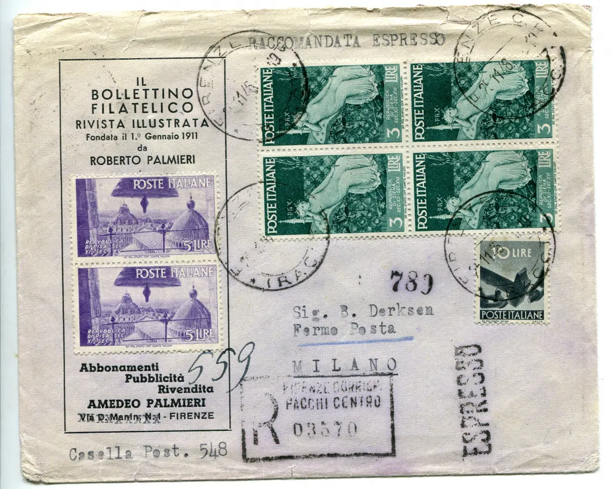 Advent der Republik Lire 3 Viertel auf Umschlag Umschlag - Advent der Republik Lire 3 Nr. 568 Viertel + Ergänzungen Nr. 558 + 570 Paar auf Umschlag Racc. express am 25.11.46 - Ungewöhnlich, im Tarif drei Häfen Cod. 244/13