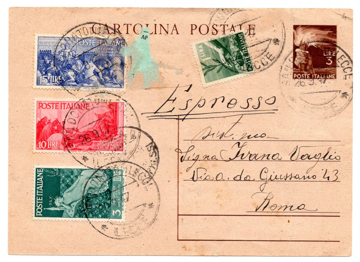 Postkarte - Advent der Republik Lire 15 Nr. 572 + Ergänzungen Nr. 550 + 568 + 571 auf Postkarte Lire 3 Expressreise nach Rom am 26.9.47 - Defektpreis von 1 Lira Cod. 267/17