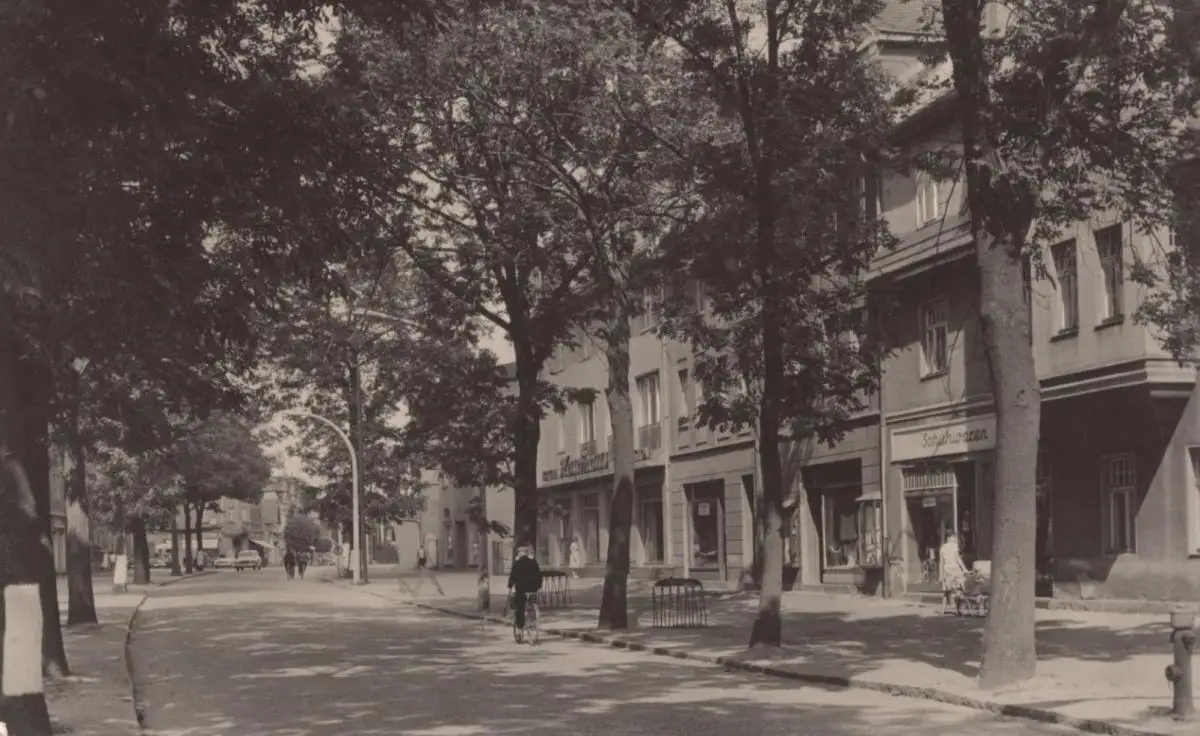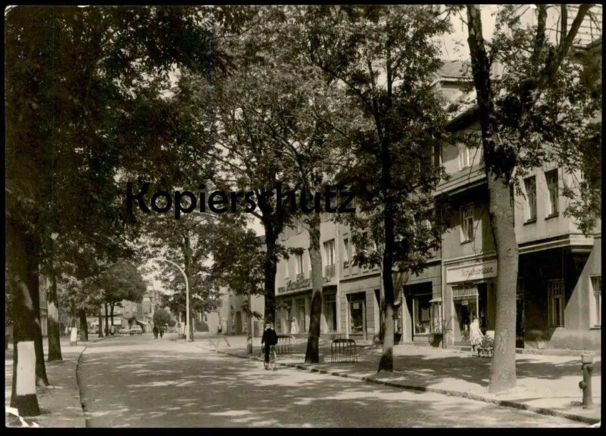 ÄLTERE POSTKARTE BERNSDORF ERNST-THÄLMANN-STRASSE KREIS HOYERSWERDA SCHUHWAREN KAUFHAUS RADFAHRER FRAU KINDERWAGEN