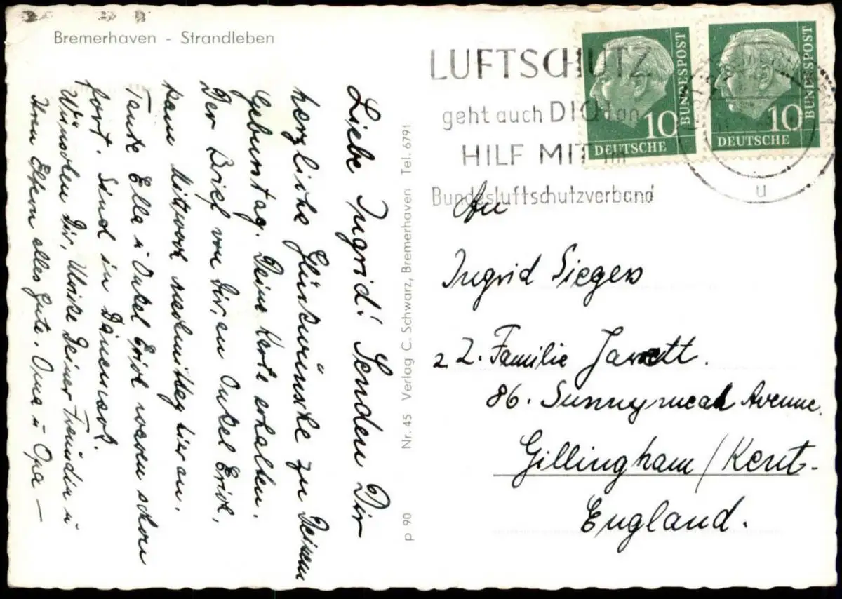 ÄLTERE POSTKARTE BREMERHAVEN STRANDLEBENVerlag: C. Schwarz, BremerhavenGelaufen: 31.7.1958 mit Stempel Bremerhaven nach Gillingham EnglandErhaltung (s. Scan): mittel, obere Ecken leicht bestoßen / 915808