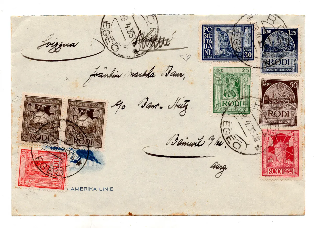 - Ägäis - Malerei Nr. 56 + 57 x 2 + 58/62 auf Umschlag Racc. von Rhodos in die Schweiz am 28.4.35 - ungewöhnliche Tarifnutzung von sieben verschiedenen Werten der wohl nicht philatelistischen Serie Nr. 924/18