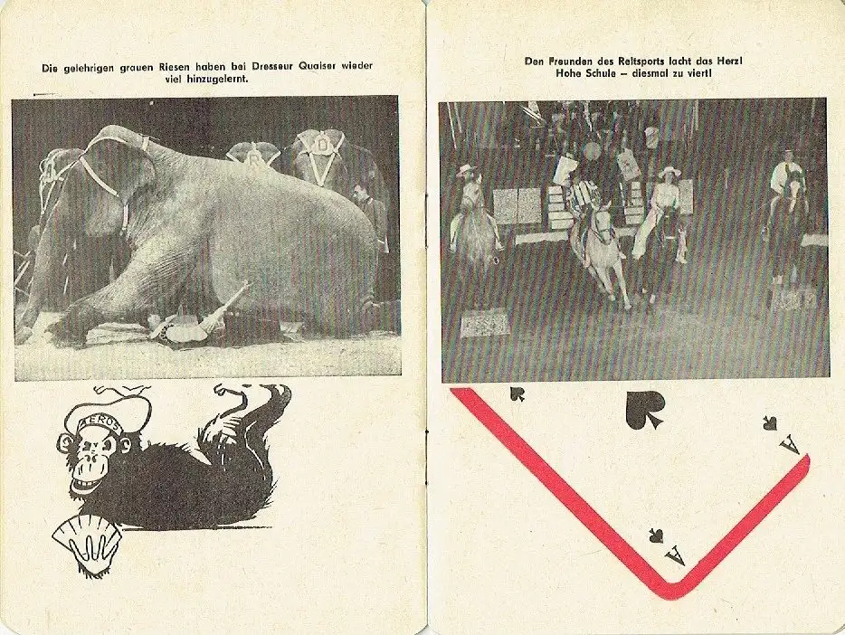 sehr guter Zustand, geringe Gebrauchs- und Alterungsspuren: Papier teils etwas vergilbt, aber Seiten sauber und ordentlich - Umschlag senkrecht mittig leicht angeknickt, Aeros Zirkus Programm - Programmheft mit der Programmfolge und zahlreichen Bildern Künstler waren z. B. Ursula Böttcher und ihre Eisbären, Helmut Rudat und seine Pferde, Peter Parwanow, Jan Malek mit seinen Löwen, ca. 12 x 18, 20 Seiten mit 19 Fotos und einigen Illustrationen