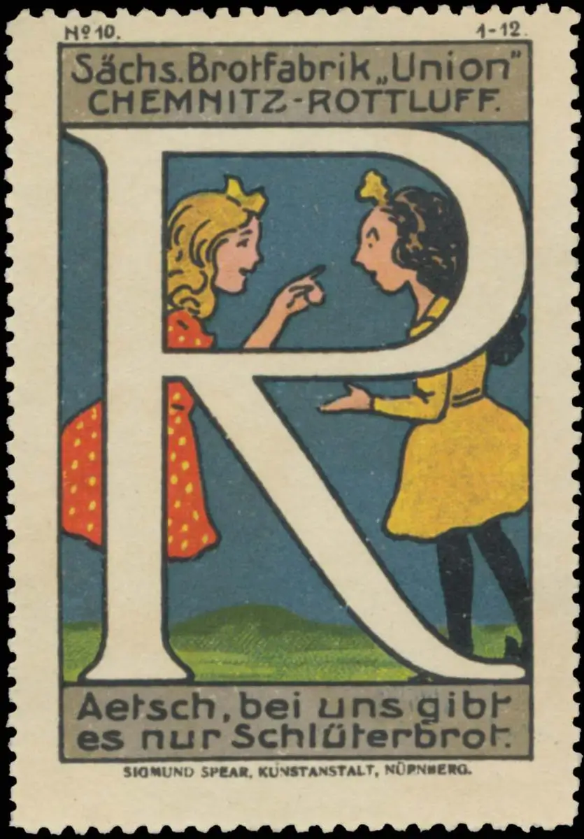 Bäckerei Schlüterbrot Buchstabenserie, Nr. 10, Druck: Kunstanstalt Sigmund Spear, Nürnberg, Größe/Zustand: 6x4 , guter Zustand, Original alte Reklamemarke die seinerzeit für die Werbung benutzt wurde