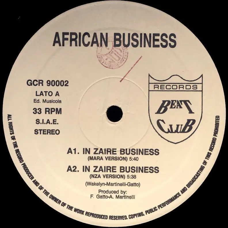 12" Maxi African Business - In Zaire Business, neutrales Cover, Zustand Platte VG+; Made in Italy 1990 Beat Club Records GCR 90002, Tracks Mara Vers. 5:40, Nza Vers. 5:38, African Business [Afroswing Vers.] 5:45, African Business [Fantafro Vers.] 5:00