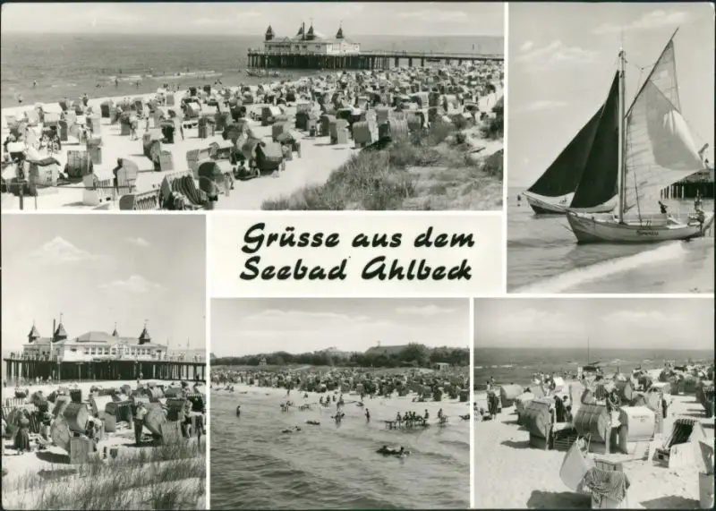 Ahlbeck (Usedom) Seebrücke, Segelboot, Strand mit vielen Strandkörben 1981