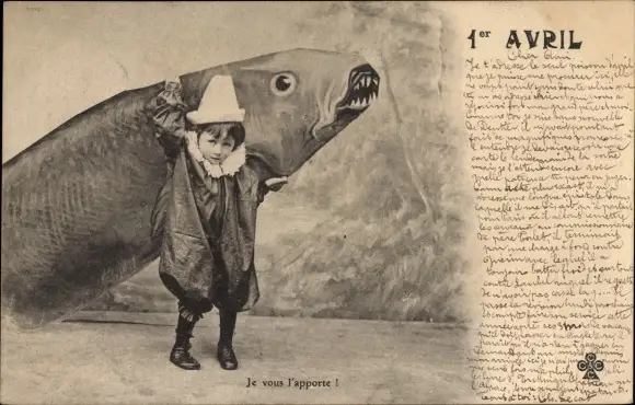 Ak 1. April, 1er Avril, Kind mit Fisch, Harlekin