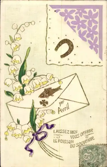 Ak 1. April, Briefumschlag mit Maiglöckchen, Fisch und Kleeblatt