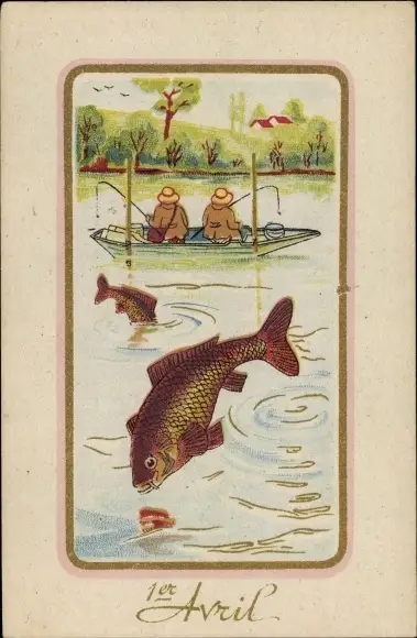 Ak 1. April, Fische im Waserr, Angler im Ruderboot